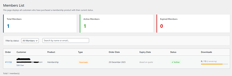Members List addon provides administrators with a powerful dashboard to view, filter, search, and manage all memberships in one place. Get instant insights with statistics cards, easily find specific members, and filter by status β all with a clean, intuitive interface.