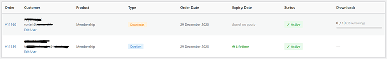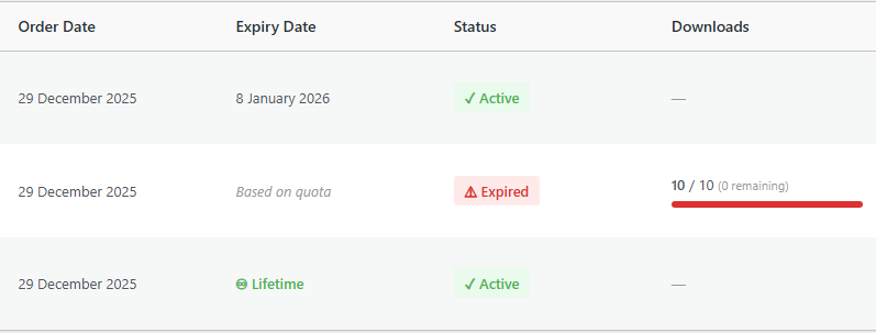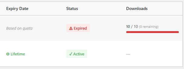 | Expires | Expiry date, "Lifetime", or "X/Y downloads" quota display |